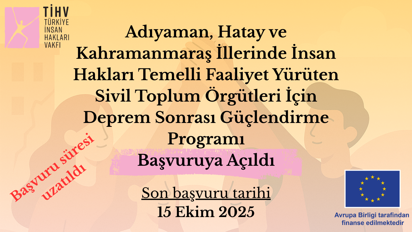 TİHV’in birlikte güçlenme ve karşılıklı güven ilkelerine dayalı dayanışma anlayışı çerçevesinde yürüttüğü “Adıyaman, Hatay ve Kahramanmaraş İllerinde İnsan Hakları Temelli Faaliyet Yürüten Sivil Toplum Örgütleri İçin Deprem Sonrası Güçlendirme Programı”, 15 Ekim 2025 tarihine kadar başvuruya açık olacaktır.